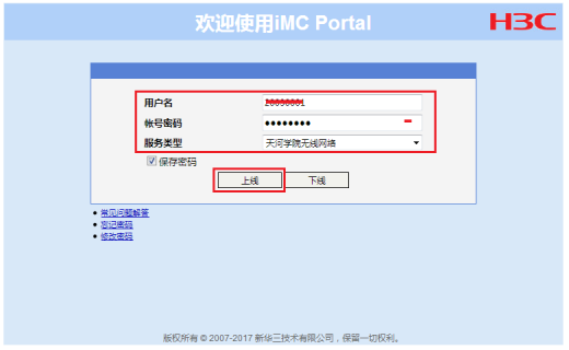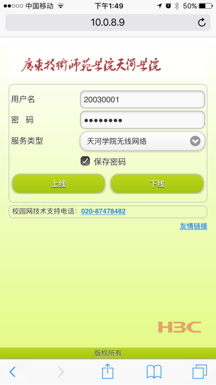 打开浏览器输入http网站(步骤类同PC机)弹出的web认证界面输入用户名和密码后,点击“上线”,进行认证。
