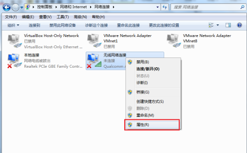 1.3 右击无线网卡选择“属性”;
