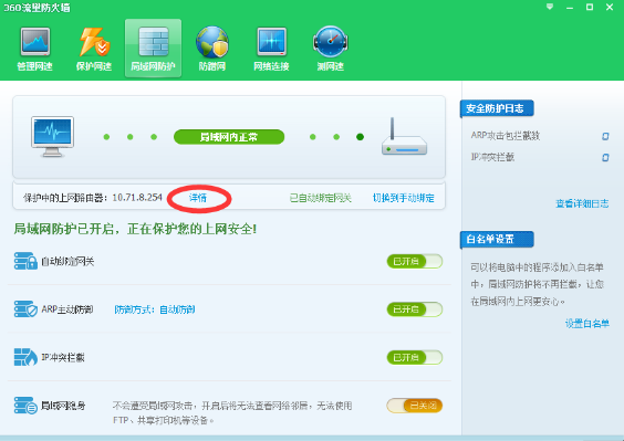 在“网络优化”栏目里打开“流量防火墙”,点击“局域网防护”,然后点击“立即开启”: