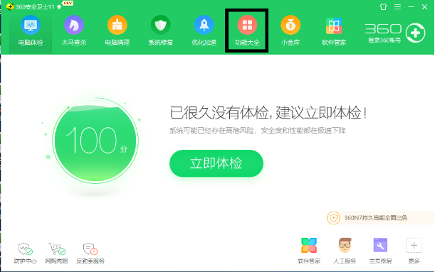 软件绑定可以通过360安全卫士来实现,打开安全卫士主界面,点击“功能大全”: