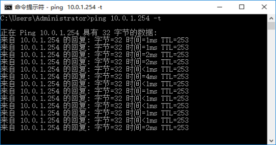 2、 在一个命令提示符窗口中输入ping 10.0.1.254 –t,进行网络连通性检测,注意ping后面有空格,-t前面有空格。如果网络正常会返回如下结果:
