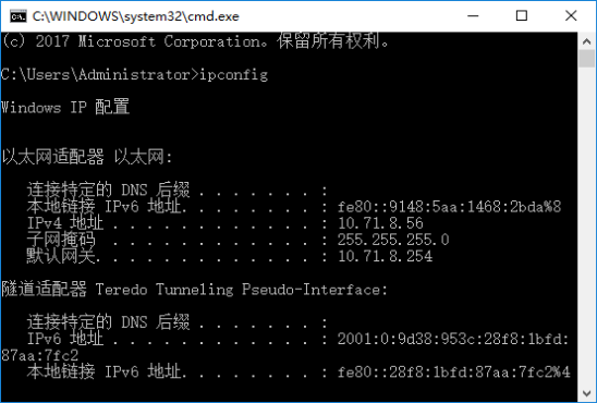 查看当前设备的IP地址和网关地址: